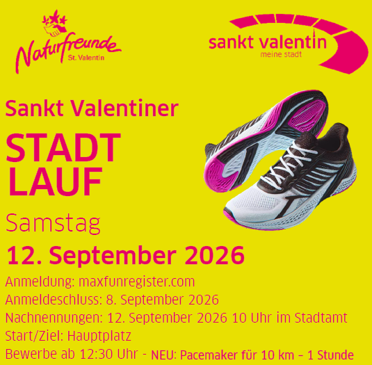 Alle weiteren Details können Sie dem St. Valentiner Stadtlauf 2026 Flyer entnehmen, der hier neben dem Stadtlauf - Streckenplan, zum Download bereit steht.